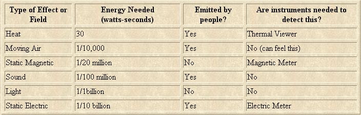the air to move initially. Below is a table showing several types of effects or fields emitted by people and